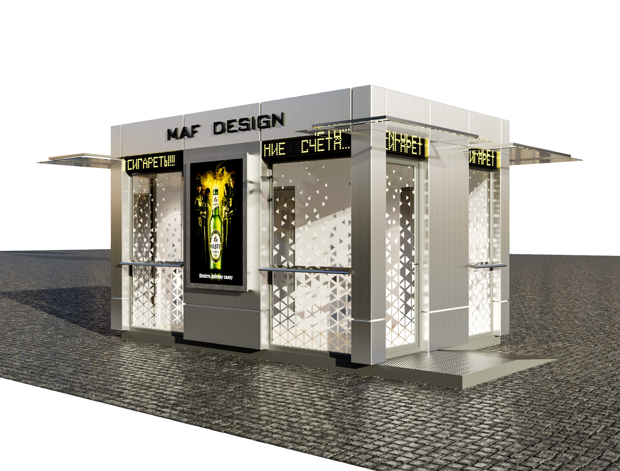 В первом варианте модель выполнена в размере 3000х2000. Киоски с большими открытыми окнами на боковых фасадах вызывают доверие у клиентов, так как покупатели могут наблюдать за приготовлением кофе или хот-догов. Вдоль окон сделана столешница, чтобы клиент мог спокойно перекусить и поставить чашечку кофе. Маркизы над окнами придают киоску стильный вид и укрывают клиентов от палящего солнца или осадков. Чем больше киоск, тем больше у вас возможностей для торговли. Киоск 4000х3000 позволяет организовать в помещение небольшую кухню, чтобы готовить пиццу, салаты или бургеры. В таком киоске можно установить холодильники для хранения напитков и продуктовых запасов.