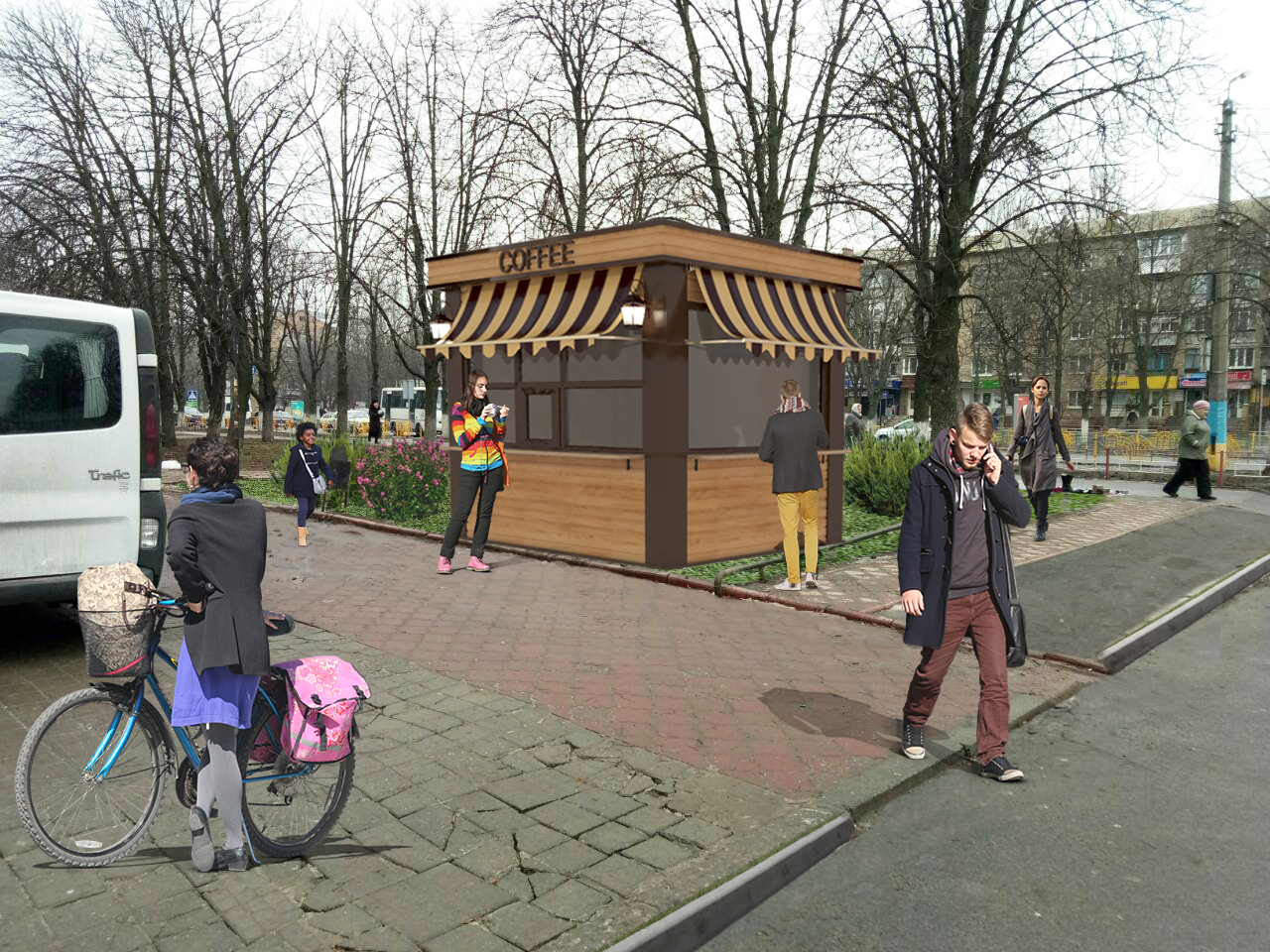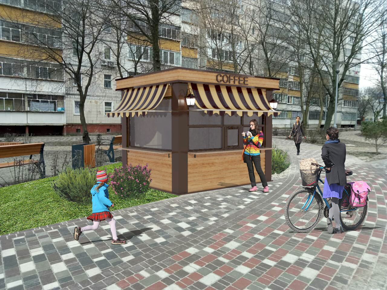 В первом варианте модель выполнена в размере 3000х2000. Киоски с большими открытыми окнами на боковых фасадах вызывают доверие у клиентов, так как покупатели могут наблюдать за приготовлением кофе или хот-догов. Вдоль окон сделана столешница, чтобы клиент мог спокойно перекусить и поставить чашечку кофе. Маркизы над окнами придают киоску стильный вид и укрывают клиентов от палящего солнца или осадков. Чем больше киоск, тем больше у вас возможностей для торговли. Киоск 4000х3000 позволяет организовать в помещение небольшую кухню, чтобы готовить пиццу, салаты или бургеры. В таком киоске можно установить холодильники для хранения напитков и продуктовых запасов.